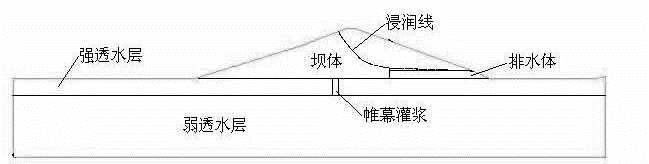 | 分区 | 黄土层 | 截水洞 | 坝体 | 砂砾 石层 | 排水体 | 帷幕 灌浆 | 强透 水层 | 弱透 水层 |