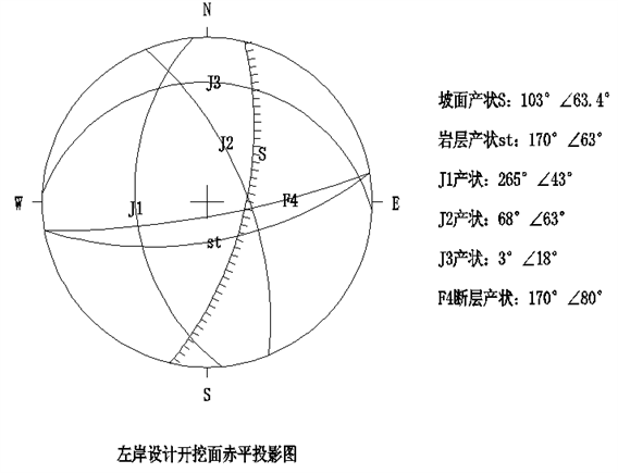 根据右岸结构面赤平投影图,可以得出:①岩层产状倾向坡内,为逆向坡;②坡面外无平行或近平行于坡面的缓倾结构面; ③J6与岩层产状交点投于坡面以外,因其靠近大圆,据圆心较远,产生滑动的可能性较小,其余节理间及节理与岩层间交点均位于坡面以内,也无明显两结构面交线组成不利楔状体,未见不利结构面组合,反映右岸现状是基本稳定的。